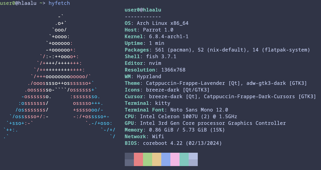 next, my acer c7 chromebook from 2013 hlaalu which is now running arch linux with nix on top, which i haven’t updated in a while: