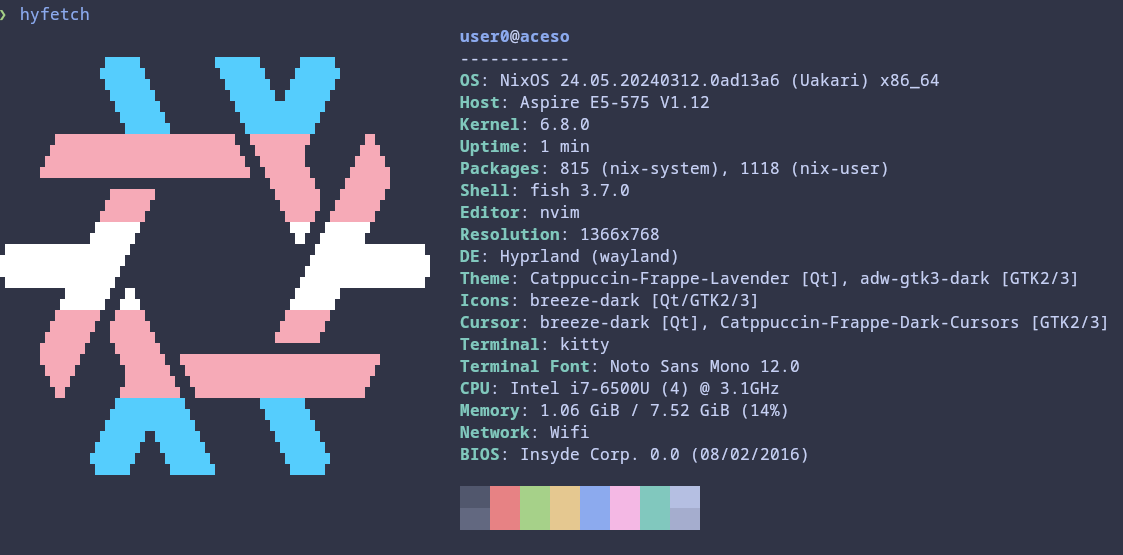 finally, my 2016 acer aspire redoran which i haven’t updated in ages (so much so that it’s still using my old hostname scheme of greek gods (telvanni was demeter, hlaalu was chronos) which i then learned wasn’t original so i changed it), also on nixOS: